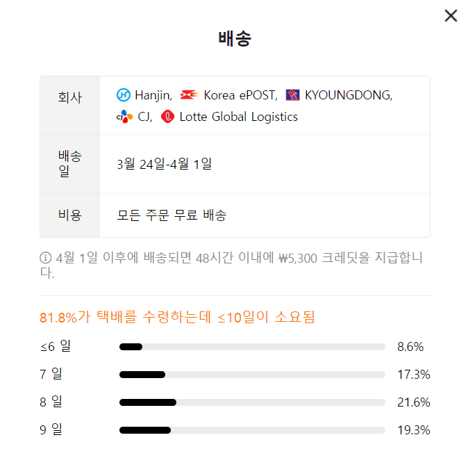 오늘 기준, 물건을 주문하면 대략 10일 정도가 소요된다는 메시지가 뜹니다. 배송 지연 시 5,300원의 크레딧을 제공하므로 정확한 도착 기한이 정해져 고객들에게 명시해 주는 점이 좋네요. 빠른 배송을 기대해 보겠습니다.