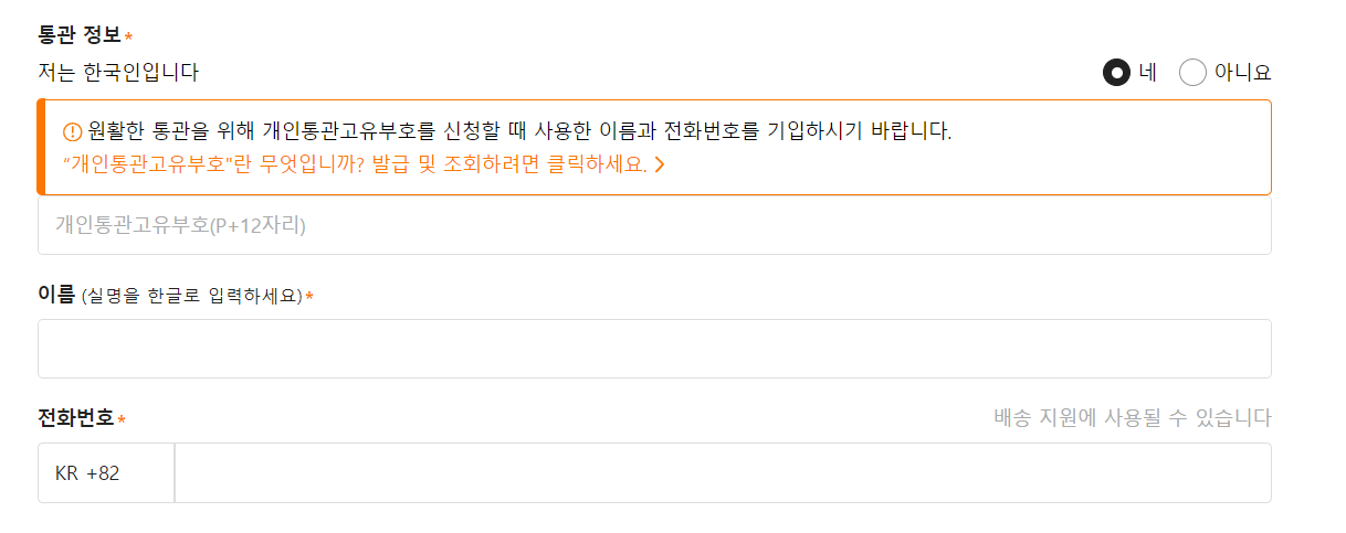 해외 직구 사이트답게 개인 통관 고유 부호를 입력해야 합니다. 개인 통관 고유 부호를 신청할 때 사용한 이름과 전화번호도 구매 전에 미리 기억해 두어야 합니다.