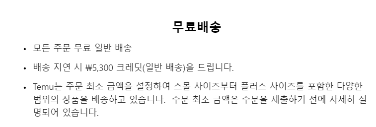 테무(Temu)는 현재 모든 주문에서 무료 배송 정책을 내세우고 있습니다. 배송 지연 시 한화기준 5,300원의 크레딧을 준다고 하니 약속된 시간 내에 배송받기를 기대해 봐도 좋겠습니다.