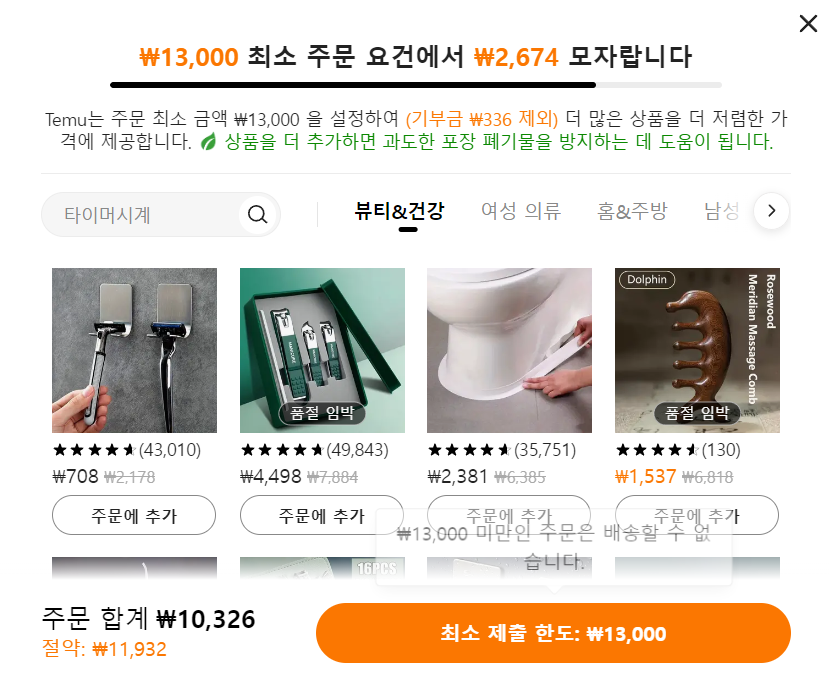 테무(Temu)의 최소 주문금액은 13,000원입니다. 1,000원 미만의 제품부터 고가의 제품까지 금액대가 아주 다양해서 최소 주문 금액을 금방 다 채울 것 같습니다. 저도 물건을 한 번 담아 보았는데 최소 주문금액에 도달하지 못하여 더 담으라는 메시지가 떴네요.
