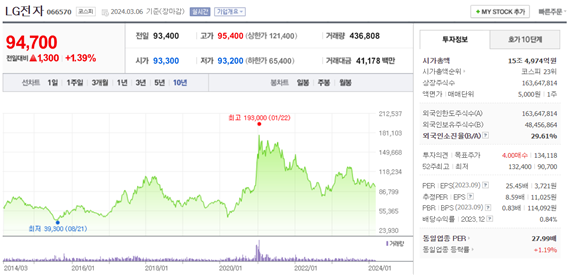LG전자의 판매 구조는 다양성을 구현하고 다면적인 접근 방식을 활용해 전 세계 소비자에게 접근합니다. LG전자는 직접 판매, 소매 제휴, 전자상거래 플랫폼 시너지 효과를 통해 지리적 경계와 인구학적 장벽을 넘어 다양한 제품 라인업에 대한 접근성을 만들어왔습니다. 한편 증시 프런티어에서는 LG전자의 실적이 견조한 펀더멘털과 시장심리 수렴을 반영하고 있습니다. 거시경제적 요인과 업계 역학관계에 따라 주가가 요동칠 수 있지만 LG전자의 회복력과 실적은 장기적 가치 창출을 노리는 기업 투자자들에게 매력적인 제안이 되고 있습니다. 주가는 3월 6일 기준 94,700원으로 마감하였으며, 시가총액은 15조, 4,974억원 입니다.